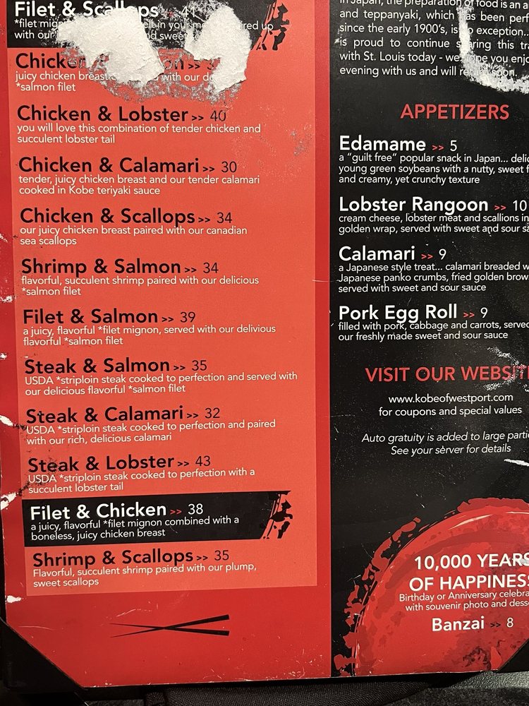 Kobe Steak House of Japan located in Saint Louis, MO offers a unique dining experience blending hibachi entertainment with delicious food. Customers rave about the huge portions, friendly staff, and entertaining chefs. The menu offers a variety of options including customizable proteins, fried rice, noodles, and flavorful sauces like Yum Yum, Hot, and Ginger. The cocktails are a highlight with impressive presentations like the flaming red dragon. The atmosphere is fun and lively, perfect for celebrations or family dinners. Despite some wait times, the overall experience is worth it for the tasty dishes and entertaining hibachi show. It's a great spot for groups, with options for private dining and outdoor seating. Make sure to try the shrimp and steak dishes for a memorable dining experience.